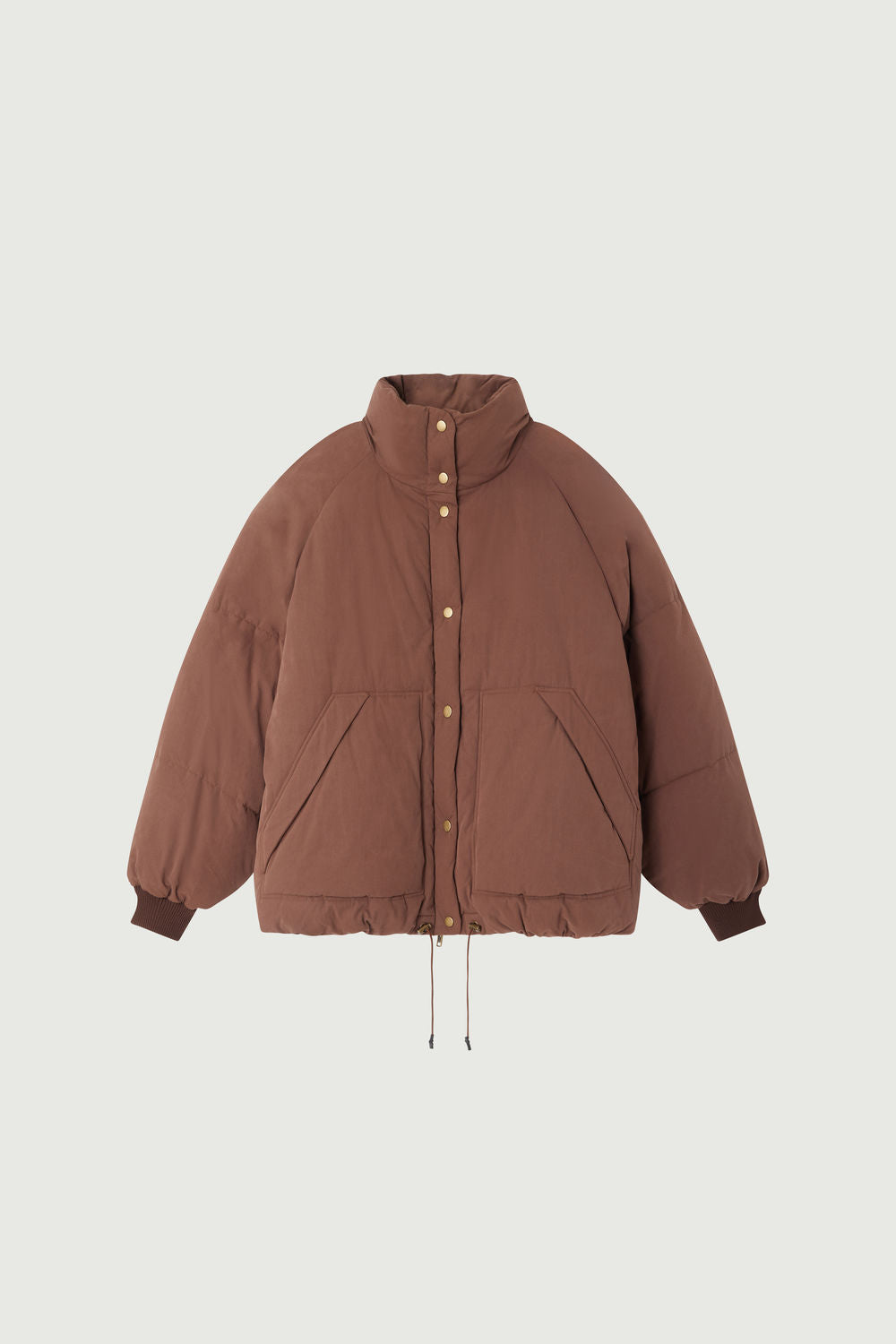 WING is a short puffer jacket made from water-repellent poplin in a soft shade of brown. It features long raglan sleeves and a button placket and hidden zip fastening. The top-stitched raglan pockets, with fleece lining, add warmth and functionality, while the adjustable hem with a drawstring ensures a perfect fit.